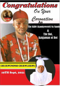 Until his death, he was the Onyewetehi of Nandi and turbaned as the Kaigaman Boi by the paramount ruler of Boi Mal Bala Likita. He is survived by his wife, Mrs Grace Chukwunonso and three children.