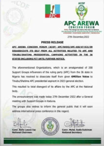 “The aforementioned Organizations, which is an amalgamated of 200 Support Groups influencers of the ruling party (APC) from the 36 state in Nigeria has resolved to dissociate itself from given 6Million Votes to Tinubu/Shatima APC presidential aspirant in 2023 general election”.