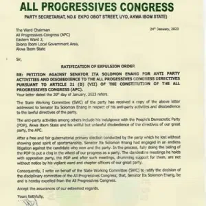 Enang who contested as a governor in the party and lost to Obong Akan Udofia has been accused of involving in anti-party activities according to the Order of Expulsion release signed by the Chairman of the party, Hon. Stephen Ntukepo.