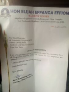 The Majority Leader of Akpabuyo Legislative Council, Hon. Elijah Effangha Effiom has defected from the All Progressives Congress (APC), to the main opposition party, the People’s Democratic Party, PDP, in Cross River State.