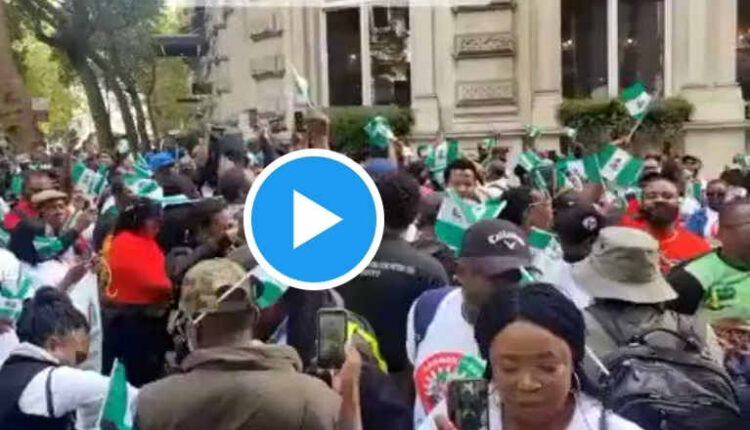 BREAKING: Massive Protest As Nigerians Storm UK Embassy In London, Accused INEC Chairman of Rigging Election [VIDEO]