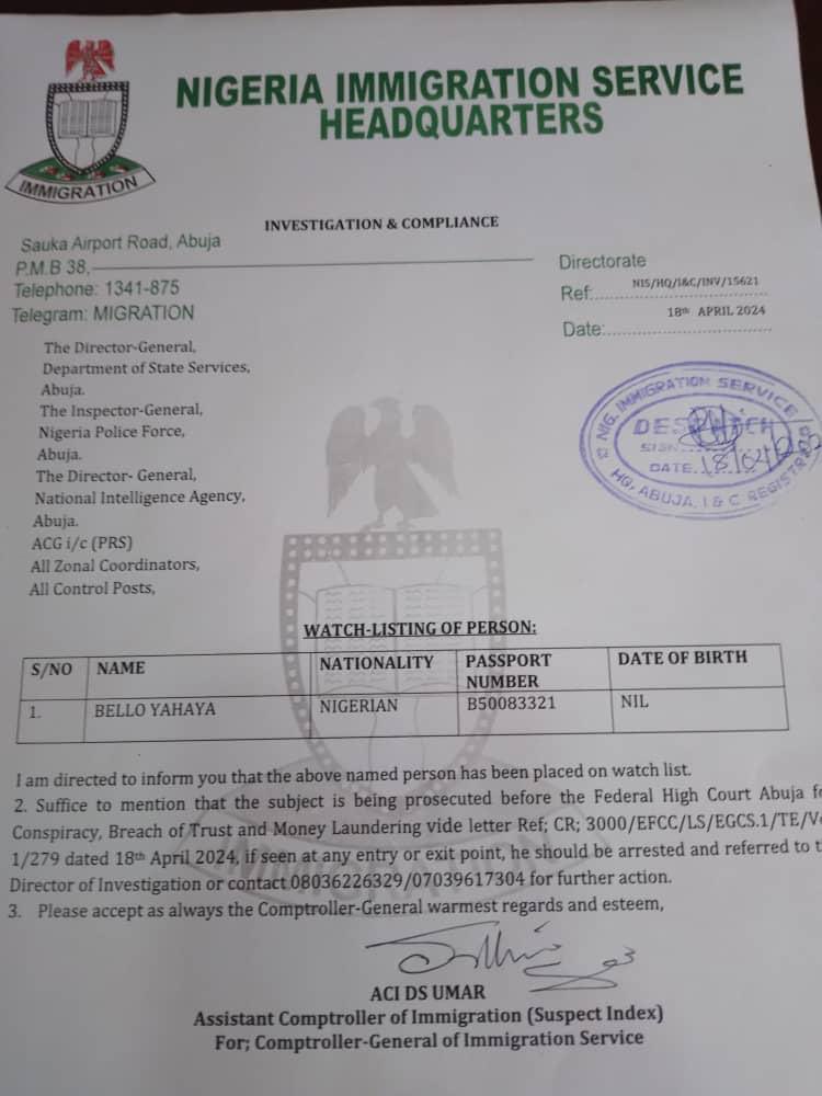 The memo, signed by ACI DS Umar, included details of Bello’s international passport and highlighted the legal proceedings against him. It stated, “I am directed to inform you that the above-named person has been placed on the watchlist.” It further outlined the charges Bello faces, including Conspiracy, Breach of Trust, and Money Laundering, noting that he is currently being prosecuted before the Federal High Court Abuja.