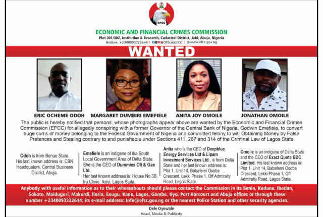 The anti-graft agency, through its official Twitter handle @officialEFCC, announced the wanted status of Mrs. Emefiele and the three accomplices, intensifying its efforts to tackle financial misconduct and corruption within the country.