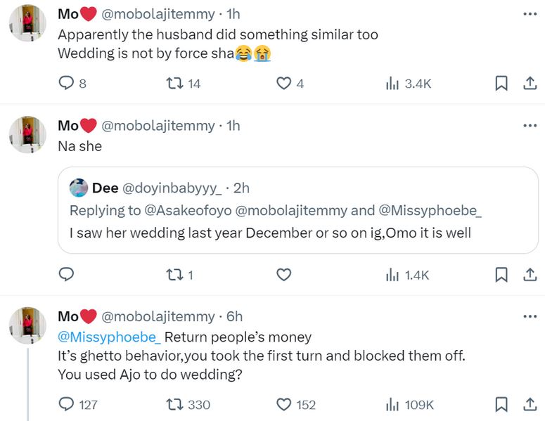 Some ‘X’ users have taken to the platform to call out a newly married woman whom they accused of going incommunicado after using the funds she got from “ajo” (group savings) to get married.