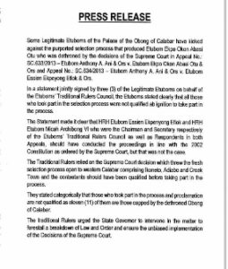 Legitimate Etuboms on behalf of the Etubom’s Traditional Council, the Etuboms stated clearly that all those who took part in the selection process were not qualified ab ignitio to take part in the process.