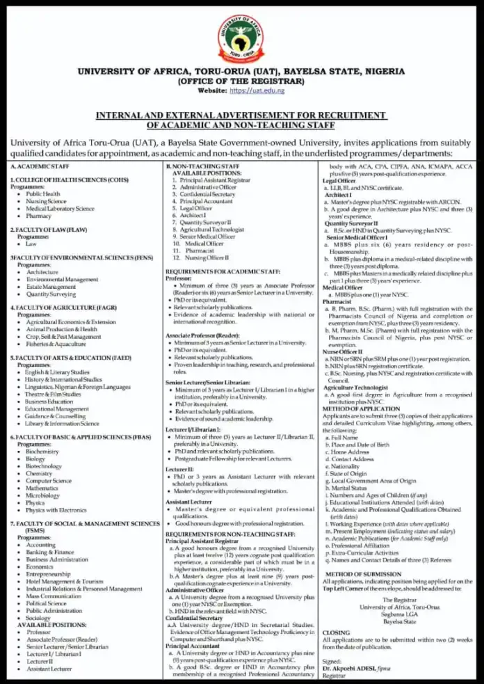The University of Africa Toru-Orua (UAT), a state-owned university in Bayelsa, Nigeria, invites applications from qualified candidates for various academic and non-teaching staff positions. The recruitment drive aims to fill roles across multiple faculties and departments. Below are the details of available positions, requirements, and application guidelines.